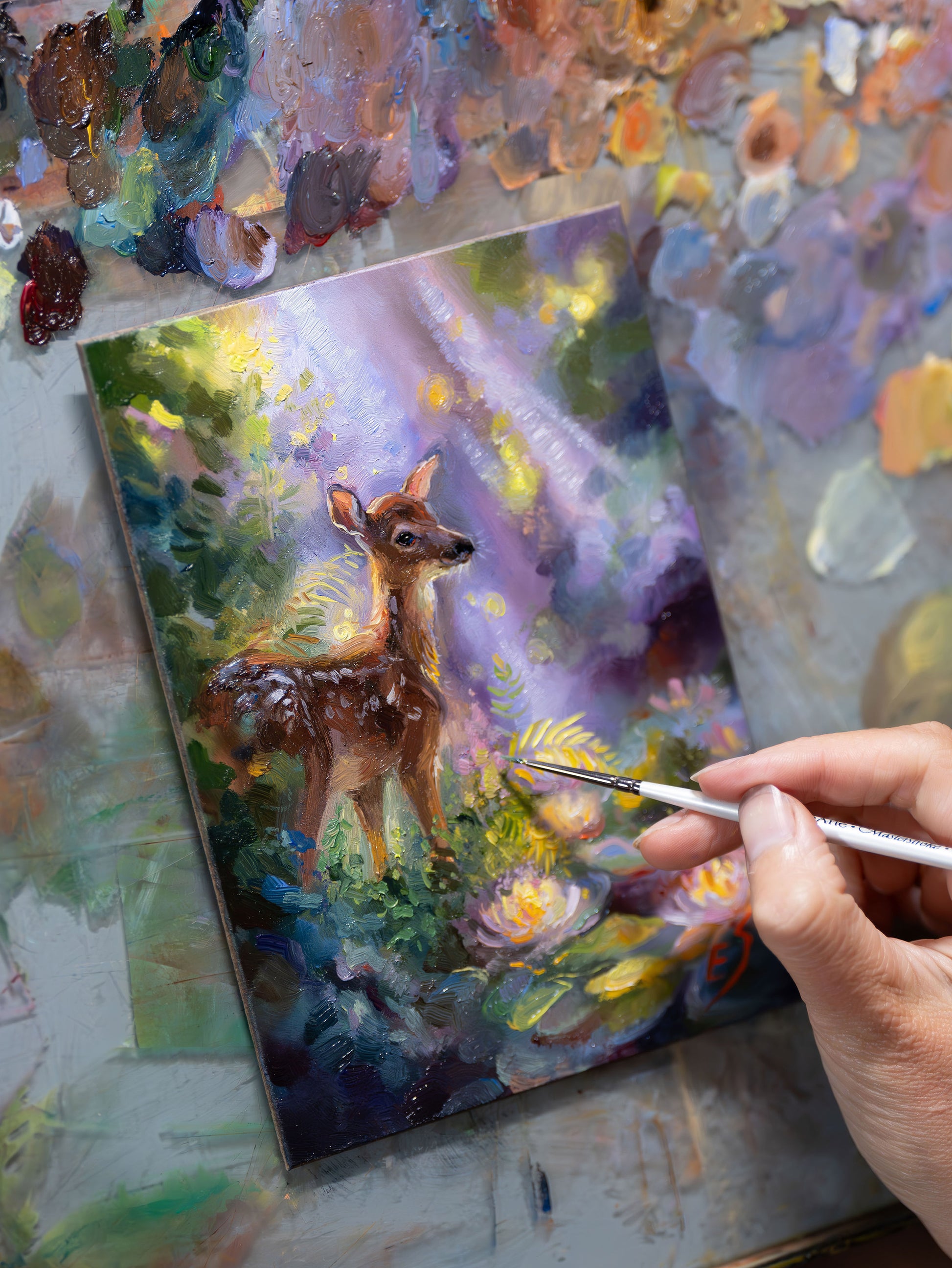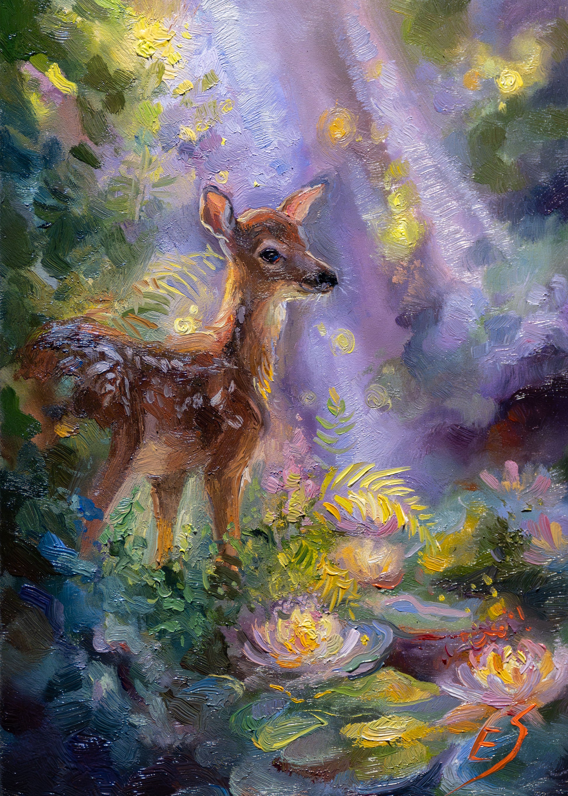 This piece captures the tender beauty of a young fawn glowing in soft light, surrounded by blooming water lilies. A painting filled with warmth, serenity, and enchantment — created to bring a touch of healing light into any space.